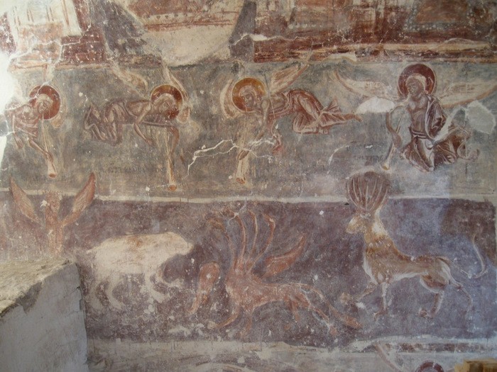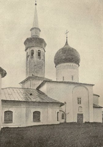 Храм повторяет основные черты архитектуры построенного на полтора века раньше собора Мирожского монастыря, но имеет некоторые существенные отличия от последнего. Внутреннее пространство храма решено в форме равноконечного креста с примыкающими к нему по углам меньшими по высоте объемами. В отличие от собора Мирожского монастыря, в интерьере которого есть иерархическое соподчинение центрального и боковых объемов, здесь центральное пространство креста и его ветви сделаны одинакового размера. Восточная ветвь креста образована центральной апсидой алтаря, боковые апсиды по сравнению с ней значительно понижены. Западные углы храма разделены на два этажа. В нижнем северном компартименте первоначально располагался придел или уединенная монашеская молельня, в южном - лестница на второй этаж. Верхнее северное помещение так же служило приделом, здесь сохранились следы малого иконостаса. Верхнее южное помещение было ризницей или хранилищем документов. Помещения-палатки верхнего яруса соединялись узким деревянным настилом, замененным в XVI веке каменным балконом.