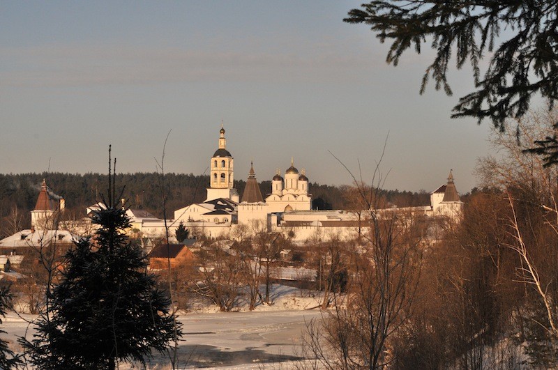 Можно выйти на остановке "Рябушки". Перейдя дорогу, спустится к монастырю, сначала по неасфальтированной дороге, затем направо, вдоль автодороги - выйти к главному входу монастыря. Это более длинный, но пологий путь!
