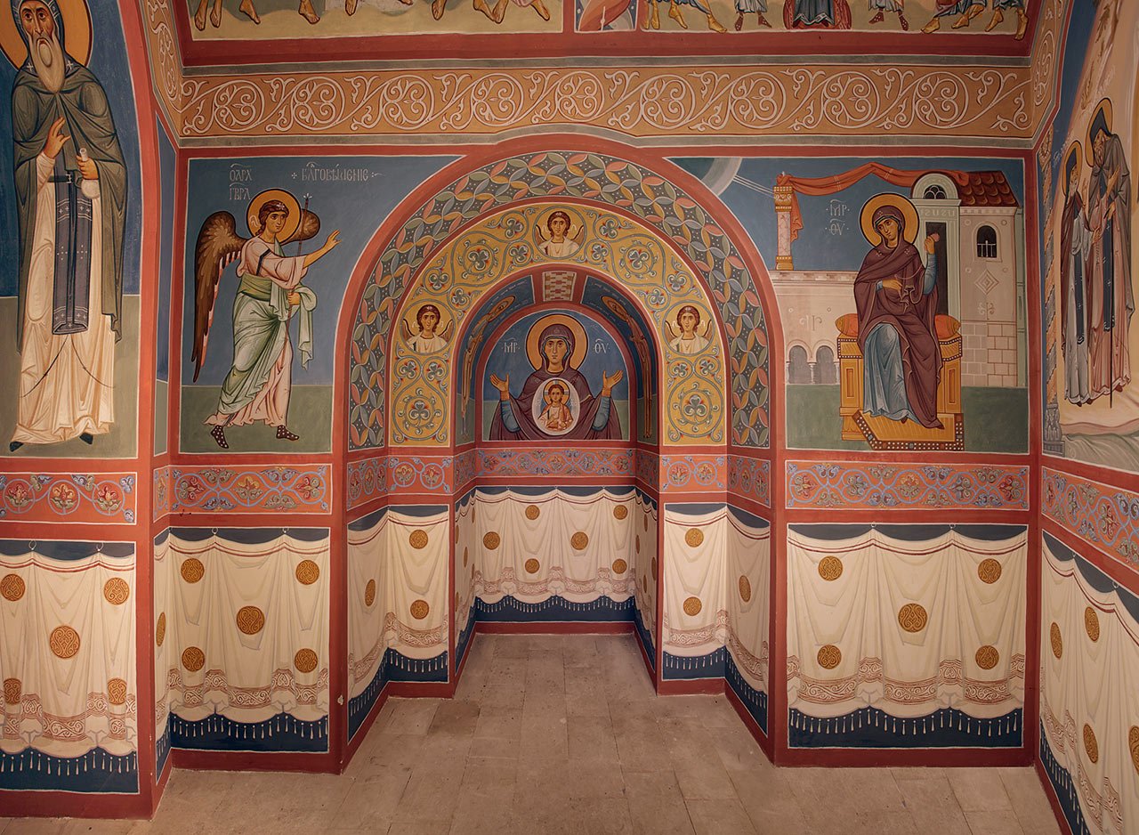После проведения монастырем ремонтно-реставрационных работ при пещерном храме был устроен скит, в котором в настоящее время проживает 11 человек братии. Фасад храма пришлось воссоздавать заново по дореволюционным фотографиям. Великолепной архитектуры фасад притвора, рабочая документация на восстановление которого была выполнена архитектором института «Донбассгражданпроект» Е.А. Ивахненко, расписан иконописцами под руководством А. Яблочкина в стиле ХІІ века. На фасаде по обе стороны от входа в храм установлены две большие мраморные плиты с выгравированными именами здесь погребённых.