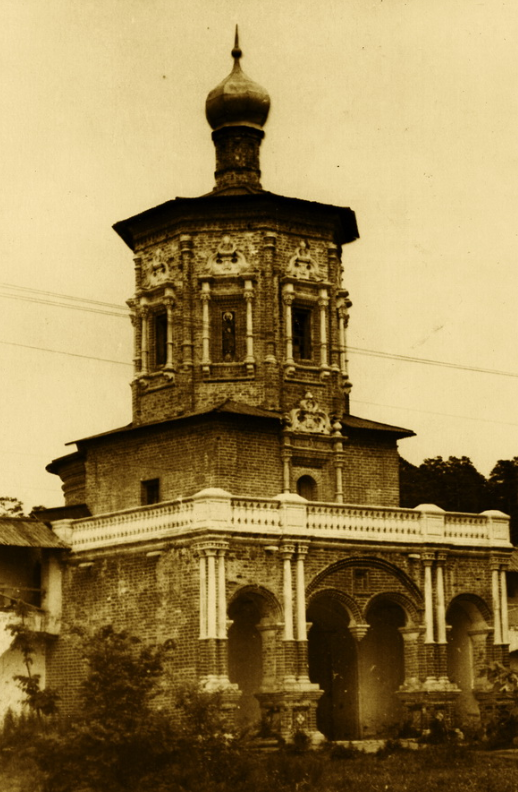 Необычна по своему облику и надвратная Иоанно-Предтеченская церковь. В 1958 году в стене этого храма был обнаружен тайник, из которого извлекли листок с надписью, гласившей, что закладка храма происходила «в лето 7203 июля в 4 день». По современному летоисчислению эта дата соответствует 1695 году. Основной декор Предтеченской церкви — полихромные рельефные изразцы.