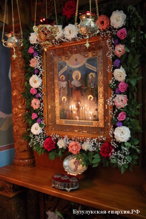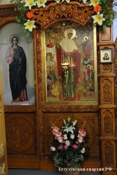 Исторический храм на пещерах был освящен в 1903 году в честь иконы, прославившейся в 1888 году в Санкт-Петербурге. Молния, ударившая в часовню у стеклянного завода, обожгла внутреннее пространство здания, но образ Божией Матери оказался не затронут огнем. Из разбившейся кружки с пожертвованиями вылетели монеты, которые и прилепились к иконе. В скором времени страждущие люди стали получать исцеления от болезней. Список с этой иконы в 1897 году заказал игумен Михаил – настоятель Бузулукского монастыря. Образ встретили при большом стечении народа, и, вскоре, он также прославился чудотворениями, именуется эта икона образом Божией Матери ««Всех скорбящих Радости» (с грошиками).