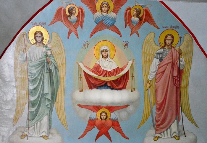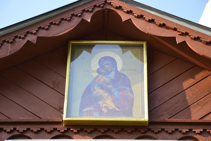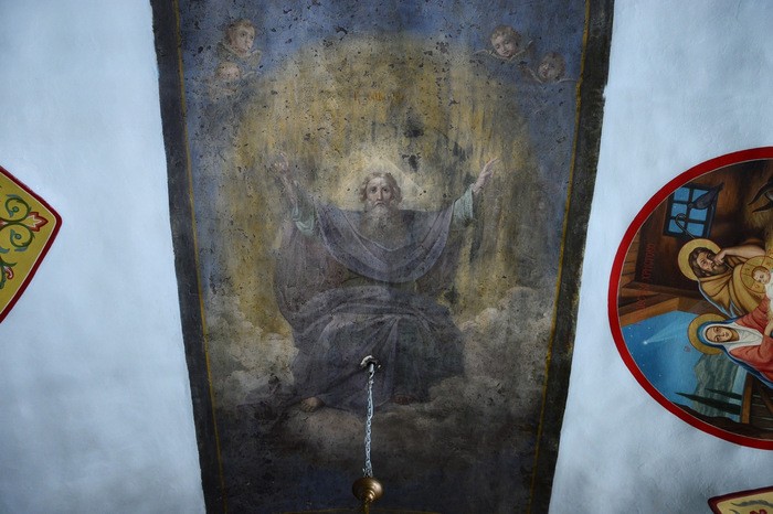 Правый предел храма посвящен иконе Владимирской Божией Матери. Здесь тоже по милости Божией сохранился большой фрагмент росписи 19 века – Бог Саваоф. По характеру сохранившегося изображения - это поздняя академическая живопись, выполненная, очевидно, на рубеже XIX-XX вв. масляными красками. А Горнее место теперь украшает икона «Господа Вседержителя» современного софринского письма.