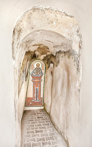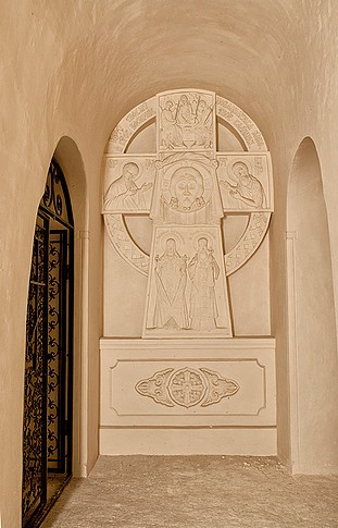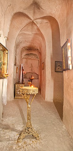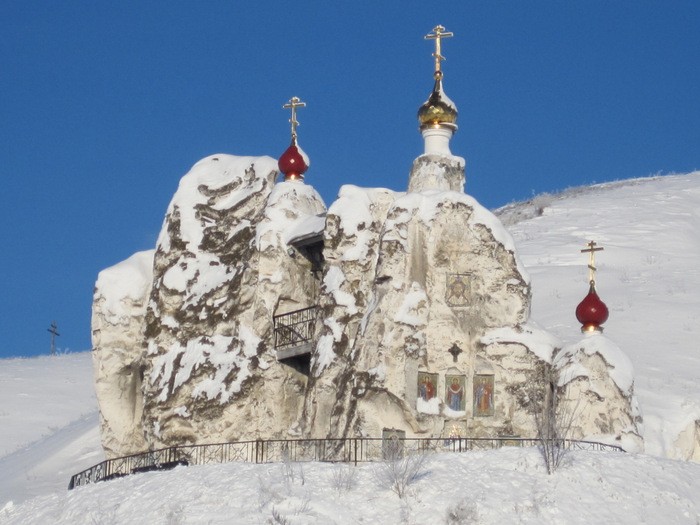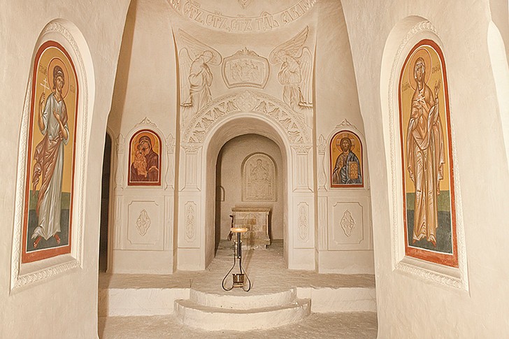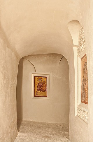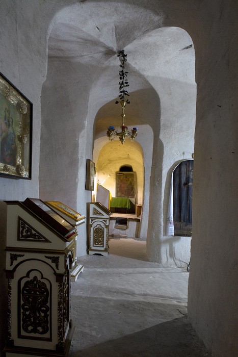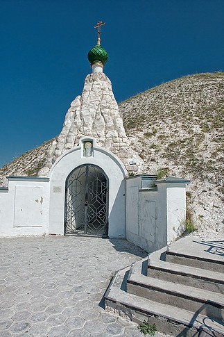 Над входом в пещерный храм в честь Нерукотворного Образа Спаса возвышаются величественные меловые дивы, напоминающие башни древних монастырей. Главный престол этого храма считается самым древним. Он освящен в честь Спаса Нерукотворного. Его предел в честь мучениц . Веры, Надежды, Любови и матери их Софии был построен значительно позже русскими подвижниками, вдохновленными древними пещеростроителями. Известно, что вход в храм был хорошо укреплен, о чем свидетельствуют следы от массивных двойных ворот, имелся запасной выход и колодец. Очевидно, в свое время пещеры собора служили также укрытием от кочевников и других неприятелей, совершавших опустошительные набеги на эти земли до второй трети XVII века.