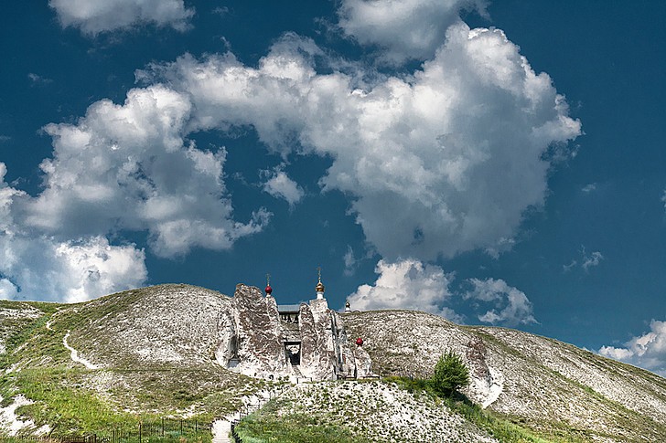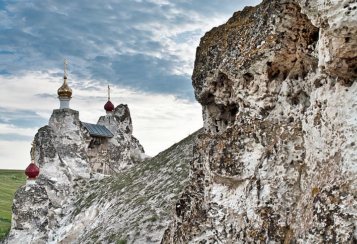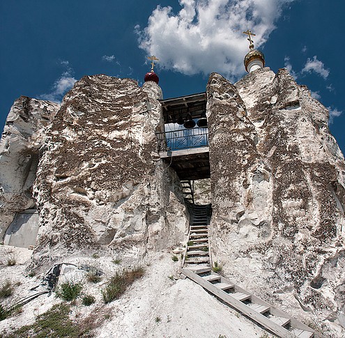 Главной достопримечательностью обители являются уникальные пещерные храмы, находящиеся в толще меловой горы. До настоящего времени сохранился уникальный пещерный собор. Над его входом возвышаются величественные меловые дивы, напоминающие башни древних монастырей. Главный престол этого храма считается самым древним. Он освящен в честь Спаса Нерукотворного. Его предел в честь св. мцц. Веры, Надежды, Любови и матери их Софии был построен значительно позже русскими подвижниками, вдохновленными древними пещеростроителями. Известно, что вход в храм был хорошо укреплен, о чем свидетельствуют следы от массивных двойных ворот, имелся запасной выход и колодец. Очевидно, в свое время пещеры собора служили также укрытием от кочевников и других неприятелей, совершавших опустошительные набеги на эти земли до второй трети XVII века.