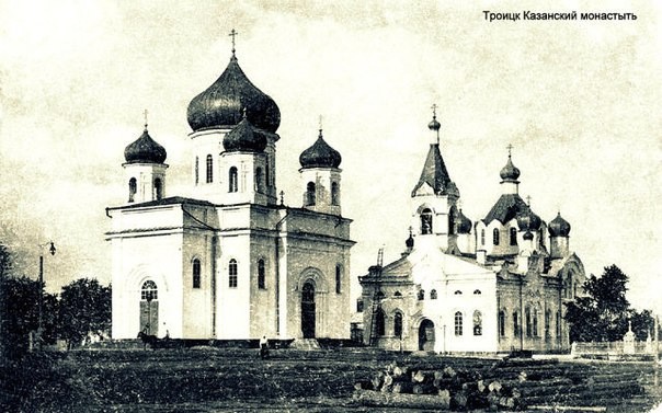 История основания женского монастыря в г. Троицке началась с устройства небольшой общины при кладбищенской церкви в 1851 году. Первые насельницы – 28 сестер из Чебаркульской крепости во главе со вдовою казака И. Щапина в конце 1851 года по разрешению городской думы перешли на жительство в г. Троицк и поселились на кладбищенской земле. В 1852 году каменная часовня была обращена в церковь честь Казанской иконы Божией Матери, которая освящена в 1853 году.