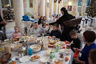 3 февраля – дети украшают приют и большую трапезную, составIMG_7872ляют меню и, получив благословение Матушки Игумении, готовят и накрывают праздничную трапезу. В этот особый день на кухне, в храме и на других послушаниях дети справляются сами: готовят службу, поют на два клироса, читают Апостол, звонят, несут икону, свечи и фонарь на Панагии. За игуменский стол настоятельница монастыря приглашает особо потрудившихся или отличившихся в послушании и смирении детей – от старших до совсем еще маленьких. Так дети учатся служить Богу и ближним, делясь всем, что имеют, с другими.