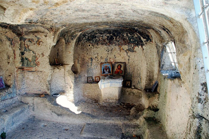 Вырублена в скале на краю отвесного обрыва. В плане неправильный прямоугольник. Внешняя стена над обрывом сложена из камня с оконными проемами. Потолок плоский. Внутренняя продольная стена расчленена четырьмя грубо вытесанными колоннами. Масляной живописью XIX в. покрыты скала над наружной стеной и стена между двумя колоннами в интерьере. К памятнику ведет широкая каменная лестница.