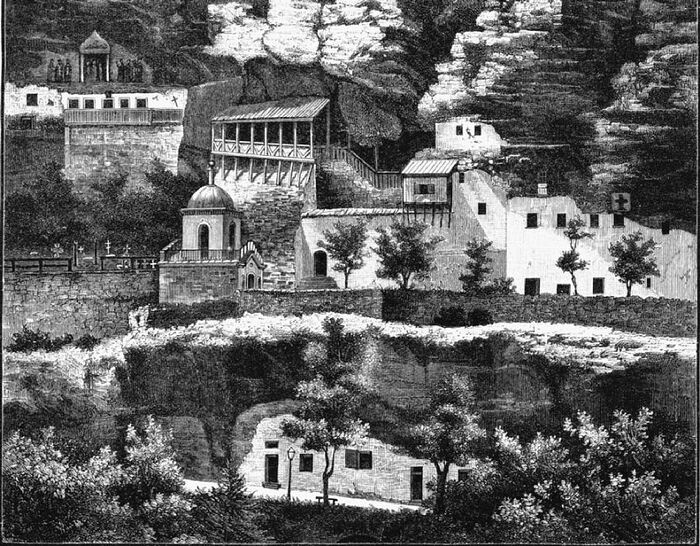 Помимо храмов были построены дом настоятеля и двухъярусный корпус, в котором разместились трапезная, кухня с пекарней и шесть келий. В скале было высечено еще 16 келий, и две построены под скалой. Наверх монастырского плато вела лестница из 84 ступеней, вырубленная в скале. Были построены два двухэтажных дома для приема паломников.