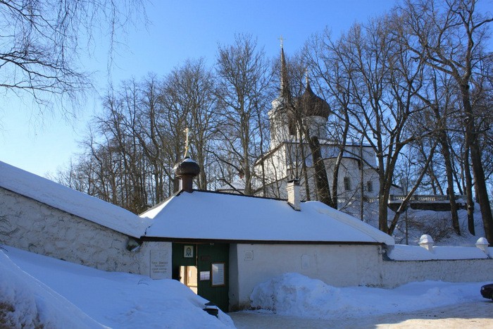 Успенский собор, возведен на месте, где по преданию «открылась благодать Божия и милость Царицы Небесной в явлении чудотворных Ея икон – Умиления и Одигитрии». Соборный храм возведен в классическом стиле псковской архитектурной школы XVI столетия. Южный придел Успенского собора во имя иконы Божией Матери Одигитрии построен на средства владельца поместья Алтун в Новоржевском уезде князя Львова в 1770 году. Здесь обычно происходило отпевание усопших. Северный придел во имя Покрова Пресвятой Богородицы построен на средства псковского помещика Карамышева в 1776 году. Под престолом этой церкви был устроен фамильный склеп-усыпальница Карамышевых.