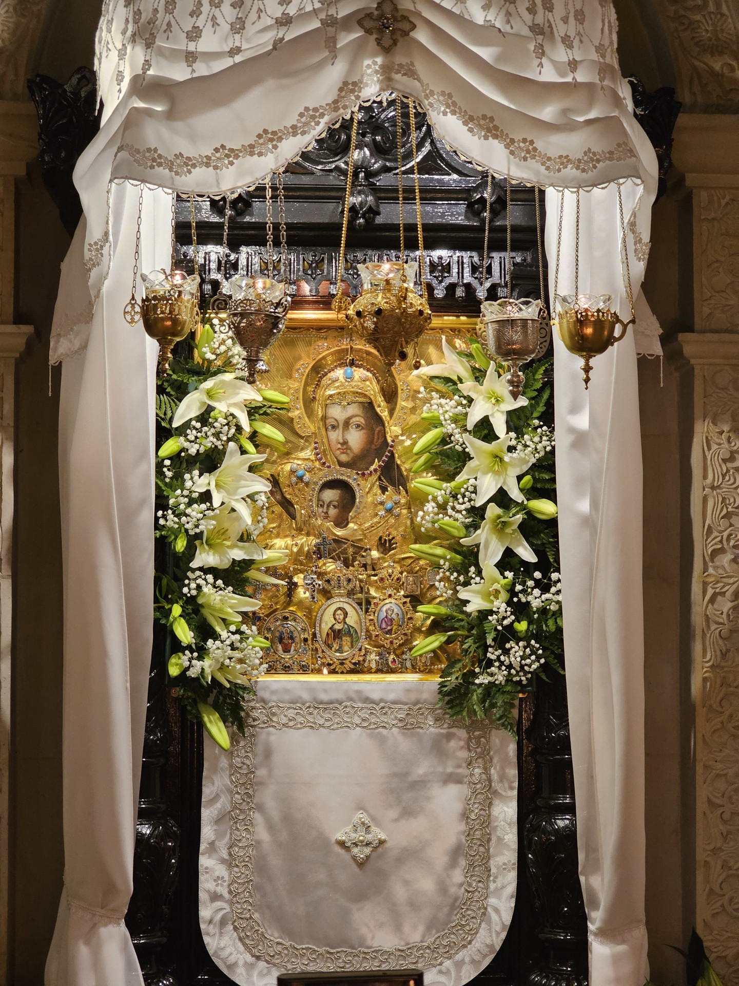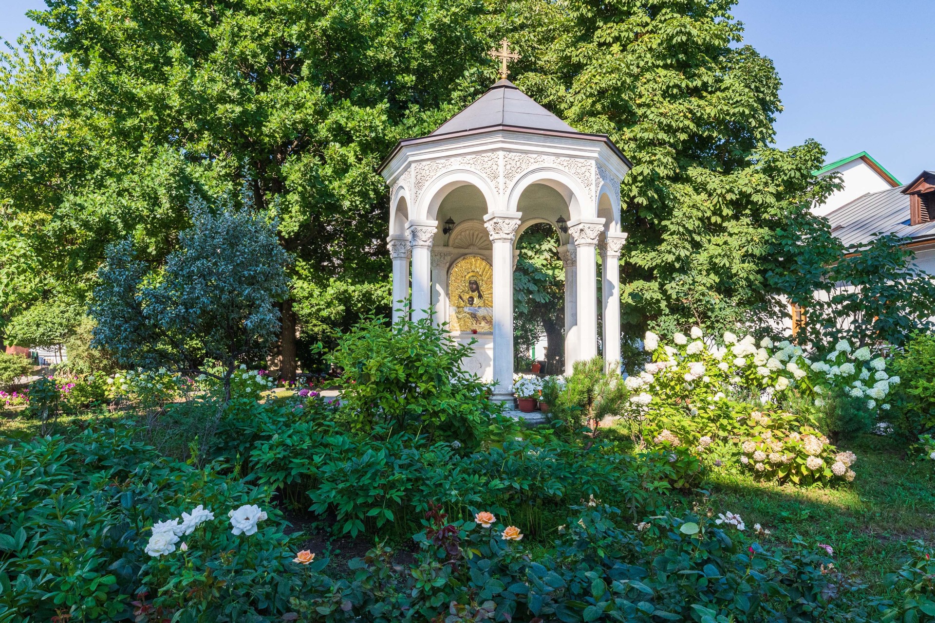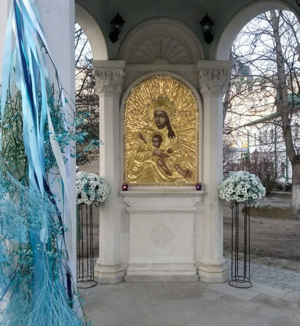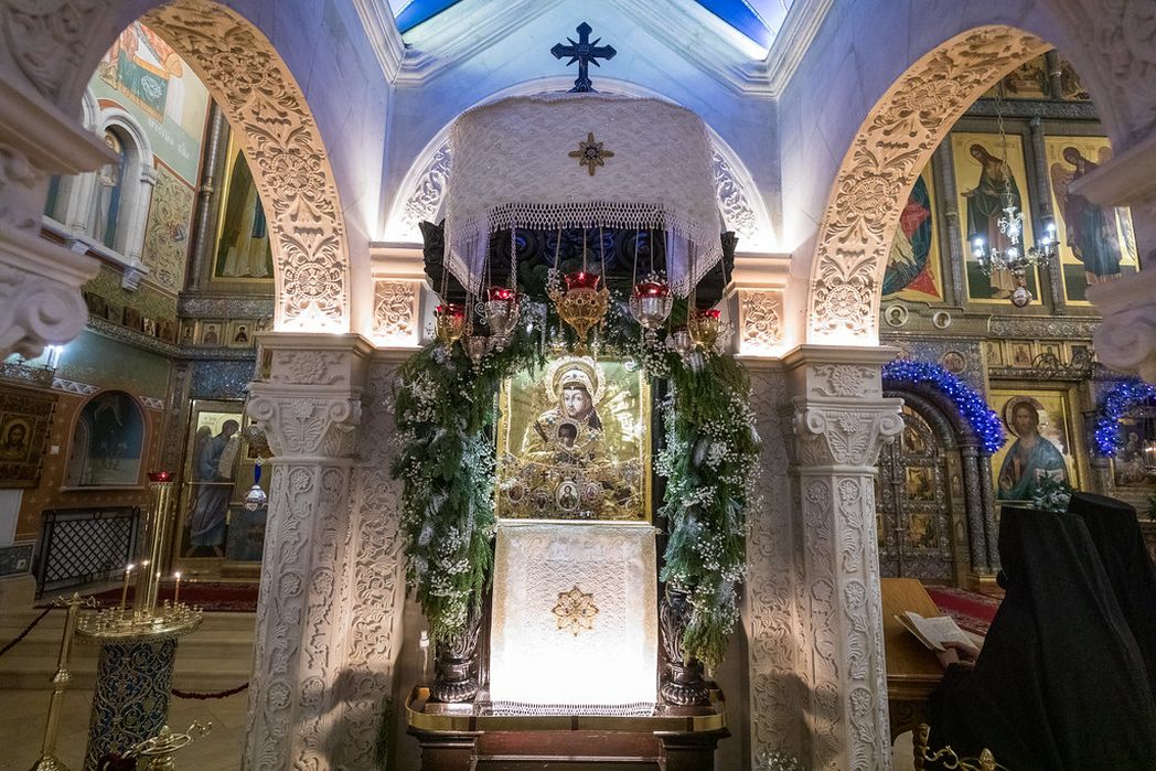 Каменный иконостас выполнен в греческой традиции: равноконечный византийский крест, растительно-животный орнамент, каменные фигуры голубей, служащих кронштейнами для лампад, страусиные яйца в подвесках к лампадам. Роспись храма также соответствует стилю храмов в Греции и на Святой Земле. Все эти характерные черты, а также центральный хорос в греческом вкусе были выбраны в память о связи главной монастырской святыни – «Милостивой» иконы Божией Матери с древним образом Милостивой-Киккской иконы Пресвятой Богородицы, находящимся с XI века на о. Кипр в Киккском монастыре.