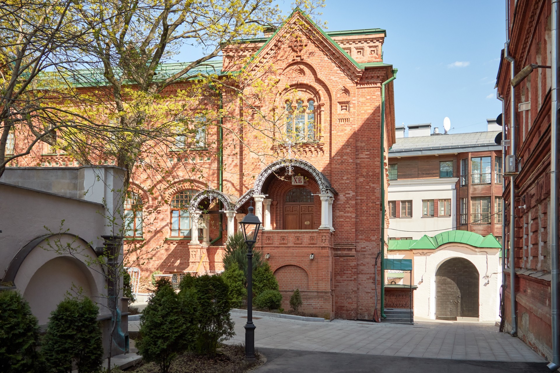 В 1849 году начались строительные работы. Новый архитектурный комплекс состоял из двухъярусного однопрестольного одноглавого храма, соединявшимся переходом – трапезной с двухэтажной богадельней. Храм был выполнен из полнотелого кирпича, нижний этаж богадельни, где располагались кельи стариц и «службы» был каменным, а верх, где располагались ризница и покои госпожи Головиной – деревянный. Известно, что В.М. Головина, будучи искусной в живописи, сама участвовала в росписи храма.