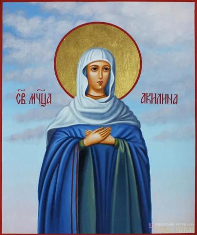 Святая мученица Акилина, уроженка финикийского города Библа, пострадала при императоре Диоклитиане (284 - 305). Родители воспитали ее в христианском благочестии. Когда девочке было всего 12 лет, Акилина убеждала сверстниц-язычниц обратиться ко Христу. Один из слуг царского наместника Волусиана донес, что она учит своих сверстниц не почитать религию отцов. Святая отроковица твердо исповедала перед наместником свою веру во Христа и сказала, что не отречется от Него. Волусиан пытался уговорами и лаской повлиять на юную исповедницу, но, видя ее твердость, велел предать истязаниям. Святую Акилину били по лицу, а потом, обнажив, бичевали. Издеваясь, мучитель спрашивал: "Где же твой Бог? Пусть придет и отнимет тебя из моих рук". Святая отвечала: "Господь невидимо со мною, и чем больше я страдаю, тем больше Он дает мне сил и терпения".