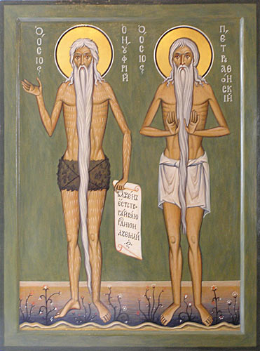 Во сне святому Петру явилась Пресвятая Богородица и указала место, где он должен был жить до конца своих дней – Святую Гору Афон. Когда корабль проплывал мимо Афона, то остановился сам по себе. Святой Петр понял, что в этом месте ему надлежит сойти, и сошел на берег. Это было в 681 году. Преподобный Петр провел в пустынных местах Святой Горы, не видя никого из людей, 53 года. Одежда его истлела, а волосы и борода отросли и покрыли тело вместо одежды.