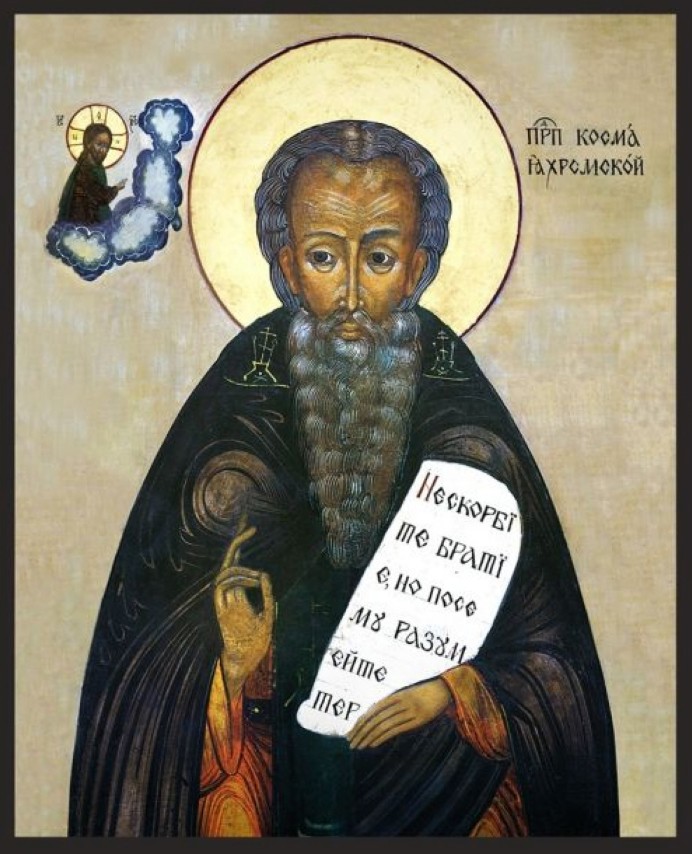 Преподобный Косма Яхромский был слугой одного боярина и во время продолжительной болезни своего господина утешал его чтением книг. Как-то, переезжая из города в город, они остановились на реке Яхроме. Здесь преподобному Косме явилась на дереве икона Успения Пресвятой Богородицы, от которой он слышал голос, повелевавший быть ему иноком и устроить монастырь. Его больной господин тогда же получил от иконы исцеление, а преподобный Косма отправился в Киев и в Печерском монастыре принял постриг. Потом с явленной иконой Богоматери он по внушению свыше снова отправился на Яхрому и в 40 верстах от г. Владимира при пособии добрых христиан построил храм в честь Успения Пресвятой Богородицы. К преподобному стала собираться братия, и образовался монастырь. Преподобный Косма был избран игуменом. Слава о иноческих подвигах святого доходила в те времена даже до великого князя. Преподобный Косма скончался в глубокой старости 18 февраля 1492 г. и был погребен в основанной им обители. Память ему также творилась 14 октября, в день празднования Божией Матери ради Ее иконы Яхромской.