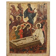 Радоватися мироносицам повелел еси,/ плач праматере Евы утолил еси/ Воскресением Твоим, Христе Боже,/ апостолом же Твоим проповедати повелел еси:// Спас воскресе от гроба.