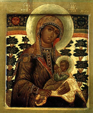 Без семене от Божественнаго Духа,/ волею же Отчею зачала еси Сына Божия,/ от Отца без матере прежде век суща,/ нас же ради из Тебе без отца бывша,/ плотию родила еси/ и Младенца млеком питала еси,/ темже не престай молити/ избавитися от бед душам нашим.Кондак, глас 5