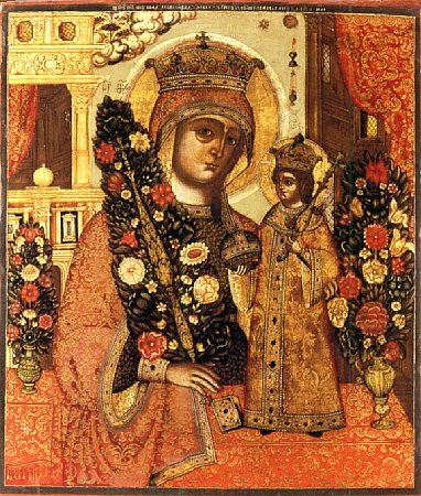 На иконе Пресвятая Богородица держит Своего Божественного Сына на правой