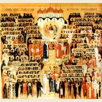 Днесь лик святых в земли нашей Богу угодивших предстоит в церкви и невидимо за ны молится Богу; Ангели с ним славословят и вси святии Церкве Христовы ему спразднуют: о нас бо молят вси купно Превечнаго Бога.
