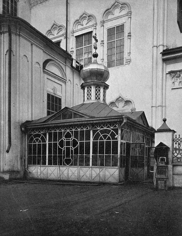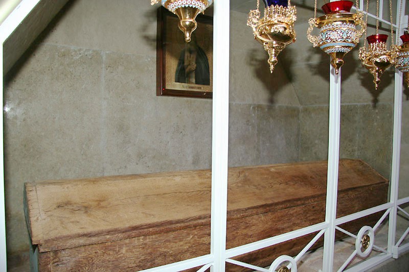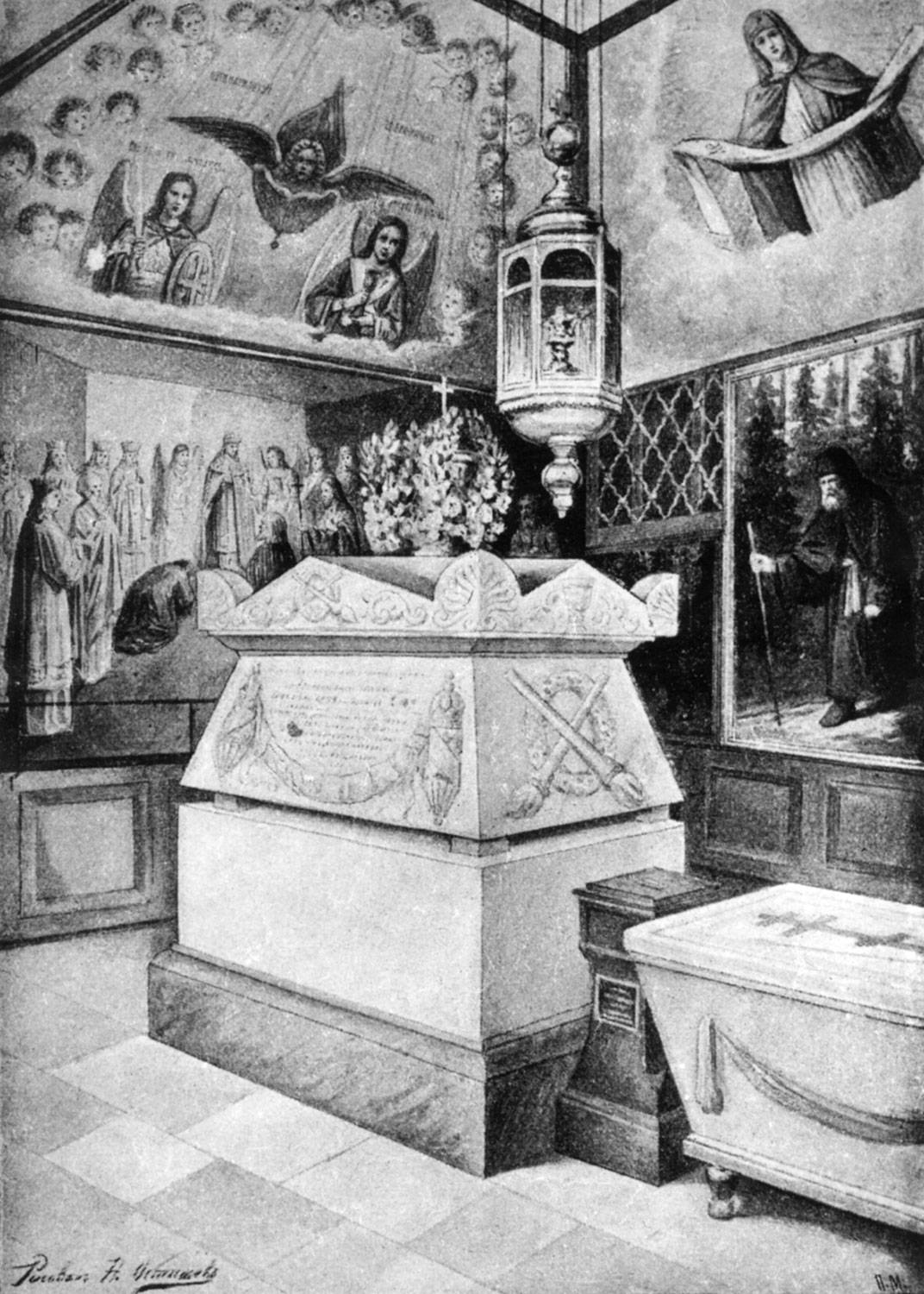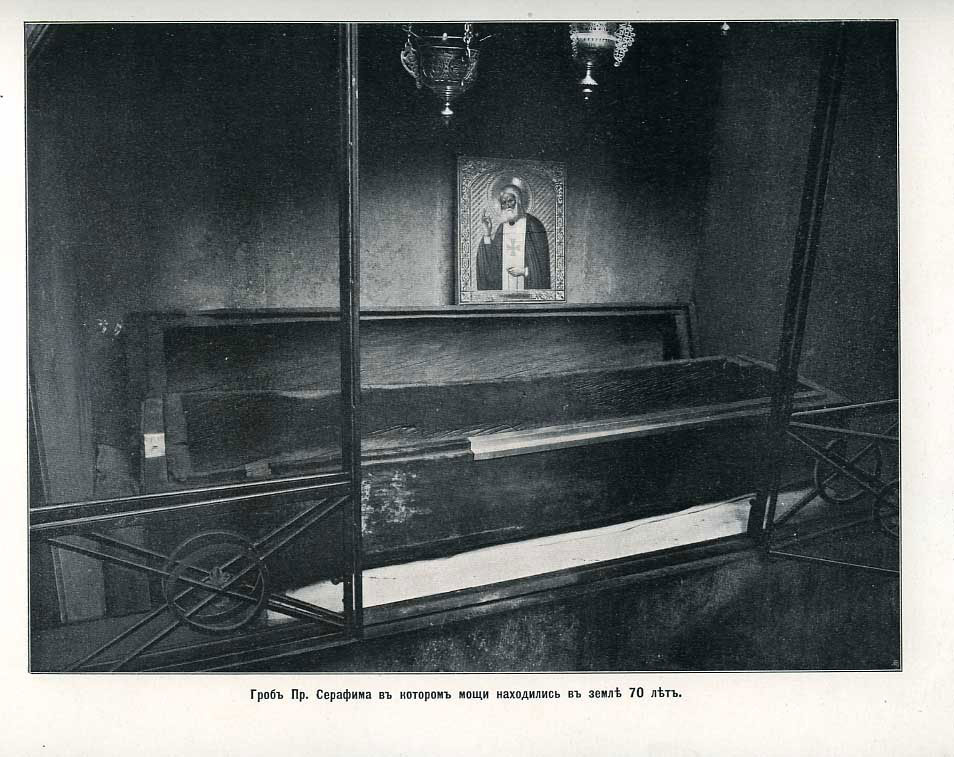 Прп. Серафим Саровский скончался в 1833 году и был погребен напротив южного фасада Успенского собора. По преданию, преподобный сам выбрал место своего упокоения рядом с могилой Марка Молчальника и даже отметил это место принесенным собственноручно камнем. Над его гробом был сделан небольшой кирпичный склеп со сводом.