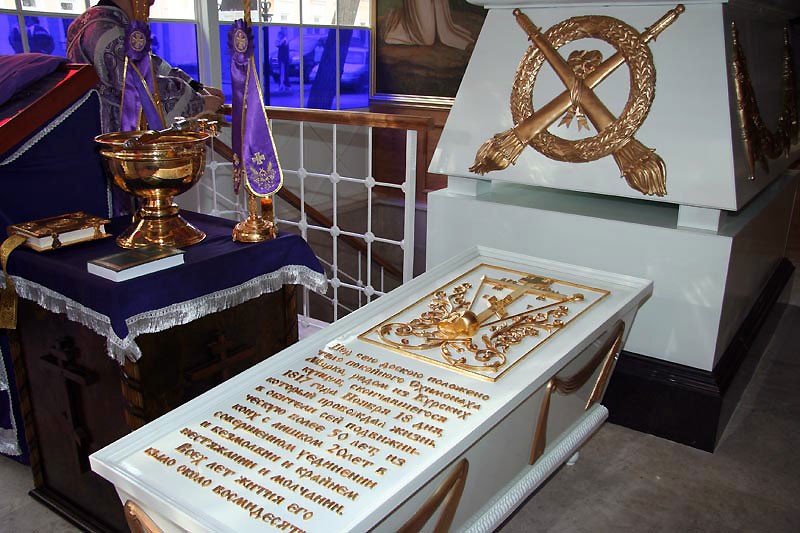 В 1890 году было принято решение построить над его могилой часовню-сень, и через два года строительство было завершено. Застекленная металлическая ажурная часовня примыкала к Успенскому собору Саровской пустыни. У нее был чугунный цоколь, а стены и барабан главки — из разноцветных стекол.