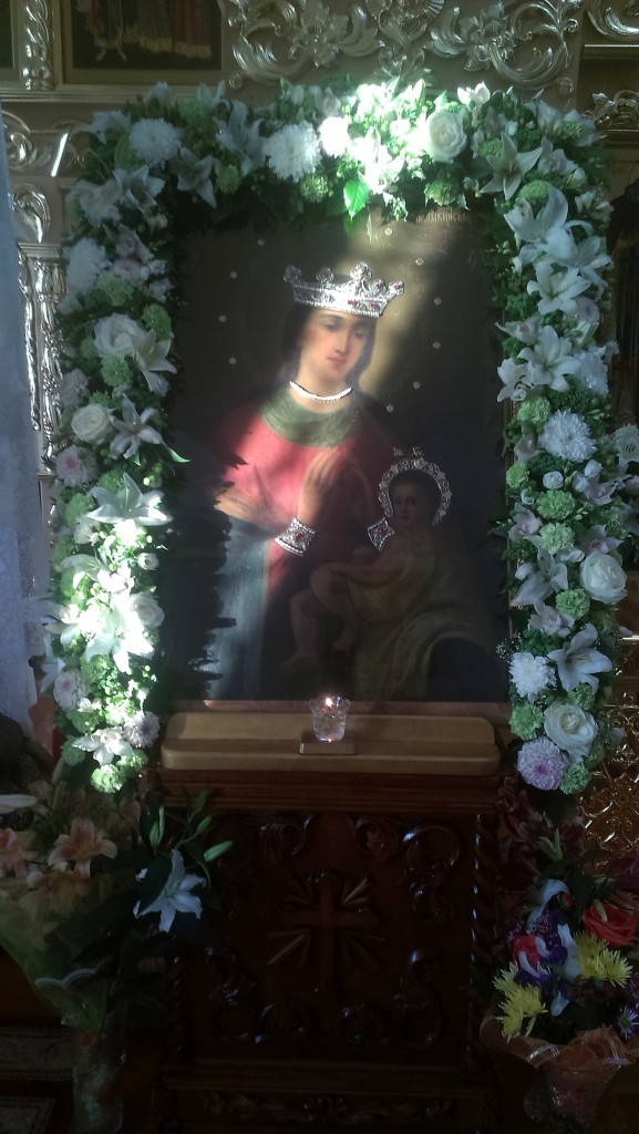 Видящи Тя, благосердая Мати, в пречудней иконе Твоей якоже сущу с нами, страждущии в неисцельнем недузе людие со слезами и верою припадают к ней, лобызающе ю и чающе от Тебе великия и богатыя милости. Тем же исцеление улучивше, велегласно вопиют Богу: Аллилуиа.