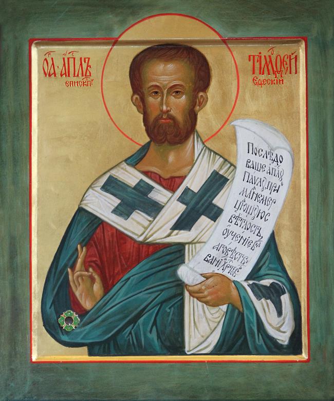Святой апостол Тимофей – любимый ученик апостола Павла. Вместе со своим учителем ап. Тимофей проповедовал в Ефесе и Коринфе, в различных городах Македонии, Италии, Испании. Видя ученика своего столь преуспевающим в добродетелях, апостол Павел поставил его сначала диаконом, затем пресвитером и наконец епископом города Ефеса и преемником св. апостола и евангелиста Иоанна Богослова на епископской кафедре.