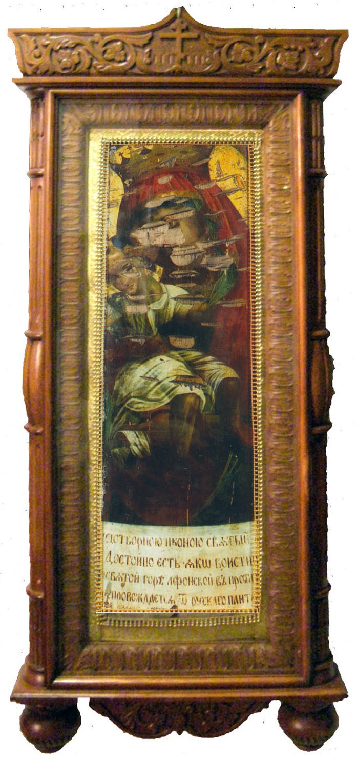 Радуйся, залог спасительный нам в иконе Твоей даровавшая; радуйся, Афонскую Гору и многия страны ею прославльшая.