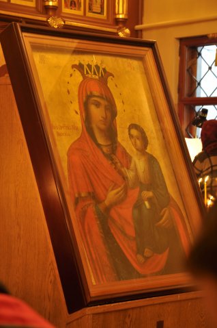 Совозсия днесь Свету Воскресения свет чистыя иконы Твоей,/ обоя весело торжествующе вопием:/ сохрани раб Твоих благодатию, Владычице.