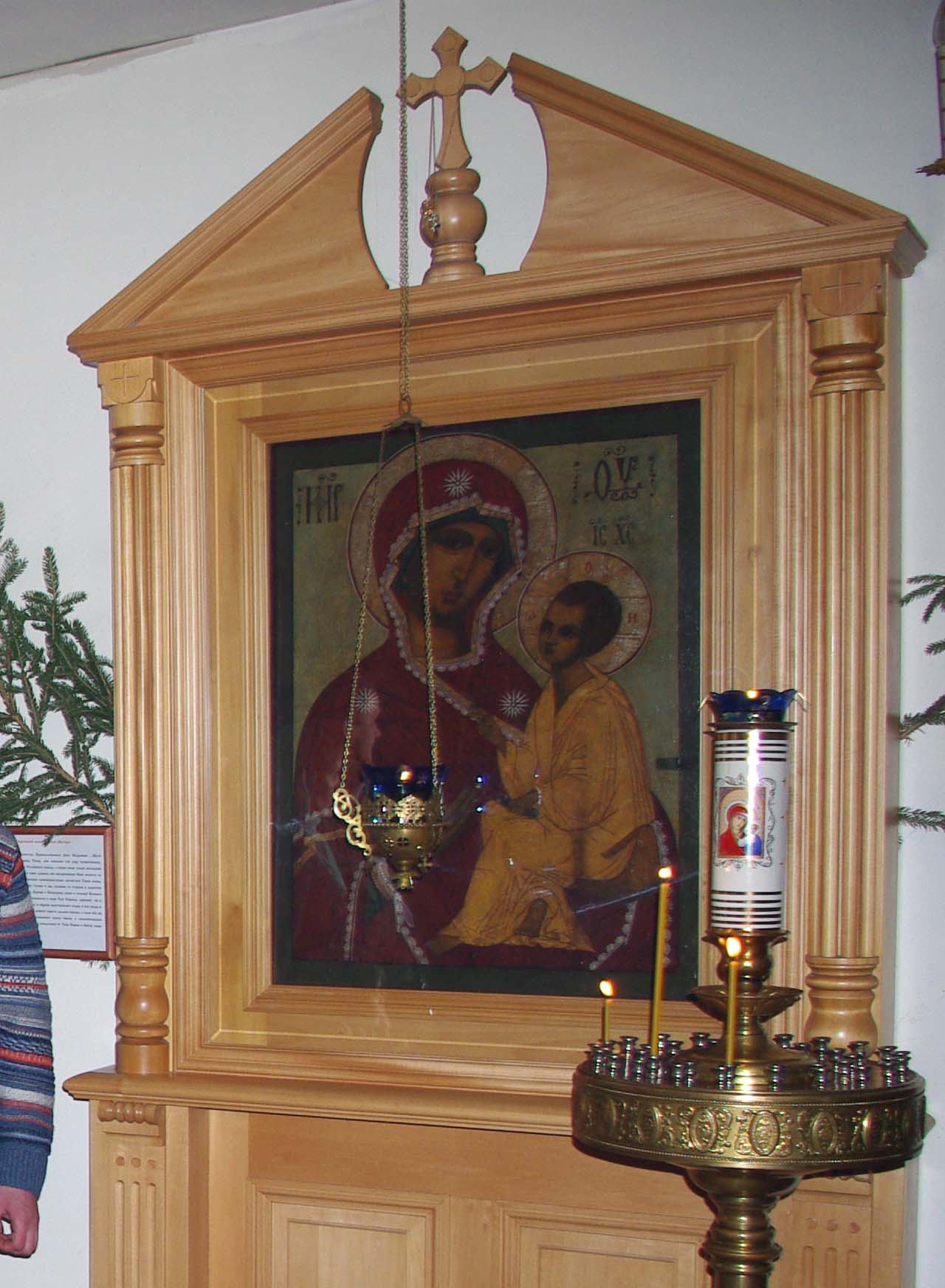 Тихвинская икона Божией Матери, по преданию, одна из икон, написанных святым апостолом и Евангелистом Лукой. В V в. из Иерусалима была перенесена в Константинополь, где для нее был построен Влахернский храм. В 1383 году, за 70 лет до взятия турками Константинополя, икона исчезла из храма и в лучезарном свете явилась над водами Ладожского озера. Чудесно носимая с места на место, она остановилась близ города Тихвина. На месте явления иконы был построен деревянный храм в честь Успения Богородицы. Усердием великого князя Василия Ивановича (1505–1533) вместо деревянного храма был возведен каменный. В 1560 году по приказу царя Иоанна Грозного при храме был устроен мужской монастырь, обнесенный каменной стеной. В 1613–1614 годах шведские войска, захватив Новгород, не раз пытались уничтожить монастырь, но заступлением Божией Матери обитель была спасена. Так, однажды, в виду приближавшегося шведского войска, иноки решили бежать из монастыря, взяв чудотворную икону, но не могли сдвинуть ее с места. Это чудо остановило малодушных, и они остались в монастыре, уповая на защиту Божией Матери. Незначительные по числу защитники монастыря успешно отражали атаки намного превосходивших их сил противника. Наступающим шведам то представлялась многочисленная рать русских, идущая от Москвы, то какое-то небесное воинство, и они обращались в бегство. После чудесной победы над шведами в монастырь прибыли царские послы. Сняв список с чудотворной иконы, они отправились в деревню Столбово, в 50 верстах от Тихвина, где 10 февраля 1617 года был заключен мир со шведами. Главною порукою мира с русской стороны был принесенный список с чудотворной иконы. Впоследствии этот список был принесен в Москву и поставлен в Успенском соборе, а затем по просьбе новгородцев, участников войны со шведами, отправлен в Новгород и поставлен в Софийском соборе. Так с начала XVII века началось всероссийское почитание Тихвинской иконы Божьей Матери.В ХХ веке, в годы лихолетья и жестоких гонений на Церковь Божию монастырь был закрыт. В 1944 году будущий архиепископ Чикагский и Миннеаполисский Иоанн (Гарклавс) и мирянин по имени Сергий (впоследствии его приёмный сын), спасая чудотворную Тихвинскую икону, увезли её в Европу, а затем – в США. Перед своей кончиной в 1982 году архиепископ Иоанн завещал своему приёмному сыну протоиерею Сергию Гарклавсу заботиться об иконе Богородицы Тихвинская и вернуть её России тогда, когда в стране изменится отношение светской власти к Церкви и будет восстановлен Тихвинский монастырь. Торжественное возвращение святыни произошло в 2004 году: 8 июля 2004 года, после 60-летнего отсутствия, святыня вернулась в Тихвинский Богородичный Успенский монастырь, который избрала для своего постоянного пребывания шесть столетий назад. Списки ее находятся во многих храмах и монастырях России