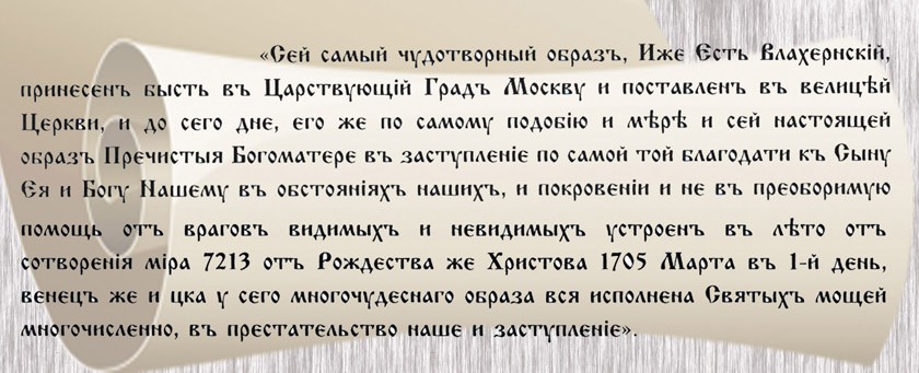 Вообще, надписи на иконах служили своего рода документом, а нередко и летописным повествованием. На деденевской иконе такая запись относительно небольшая, по ней и реконструируется ее происхождение. В первой части записи говорится о многочудесной Влахернской иконе, принесенной в Москву, во второй – удостоверяется, что данное повторение сделано по ее образу и подобию 1 марта 1705 года, третья часть говорит о том, что эта икона – мощевик.