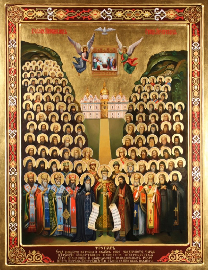 В центре иконы помещены преподобные Антоний и Феодосий – основатели Лавры. Они держат в руках свитки, на свитке прп. Антония написано: «Господи, да будет на месте сем благословение святыя Афонския горы», на свитке прп. Феодосия: «Господи, во имя Пресвятыя Твоея Матери вознагражден бысть дом сей». Тут же изображен святой равноапостольный князь Владимир, другие святые, имена которых прочно вошли не только в историю церкви, но государства Российского.