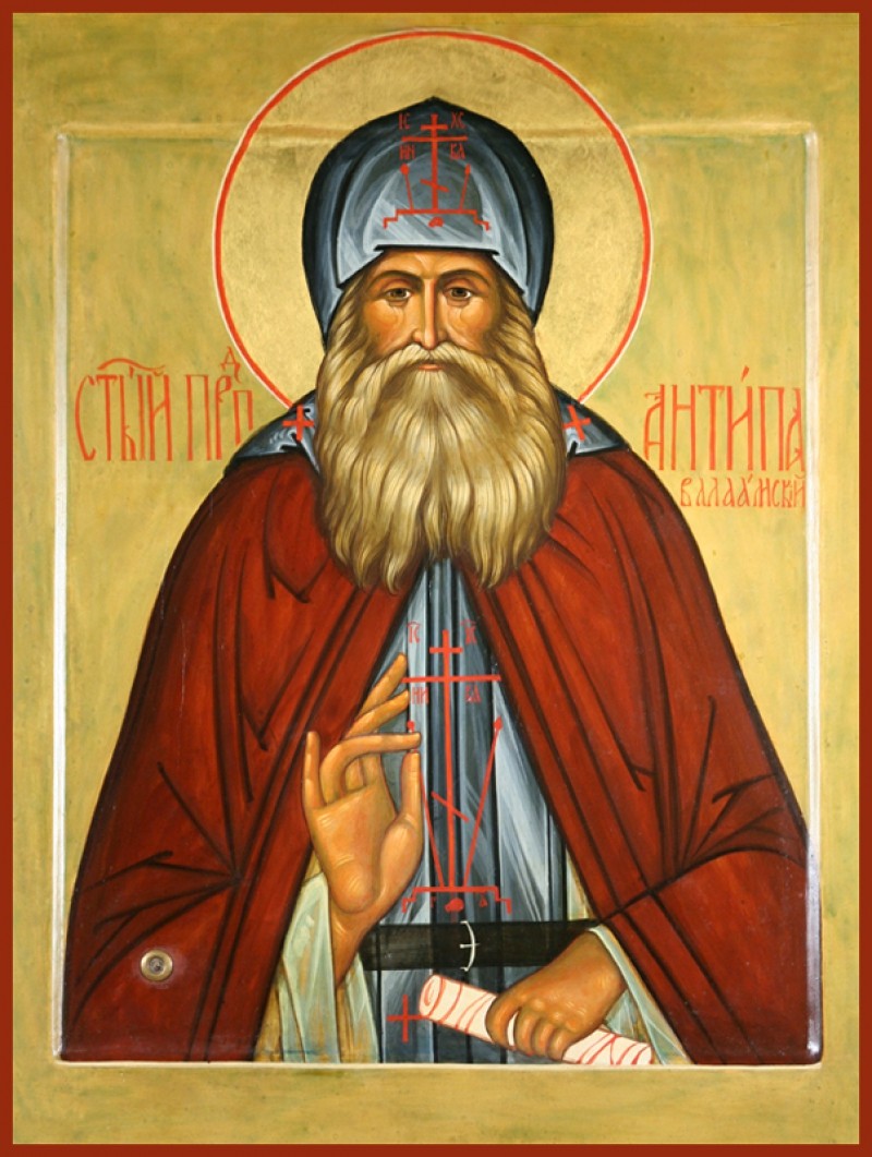 Икона преподобного Антипы Валаамского написана для монастыря в конце ХХ века, в 1998 году на нее установлен мощевик с частицей мощей святого.