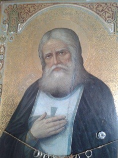 Икона преподобного Серафима Саровского с частицей его мощей .