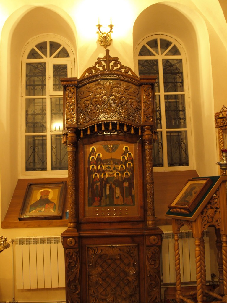 В храме Воскресения Словущего напольный киот с иконой собора Оптинских старцев с частицами их мощей