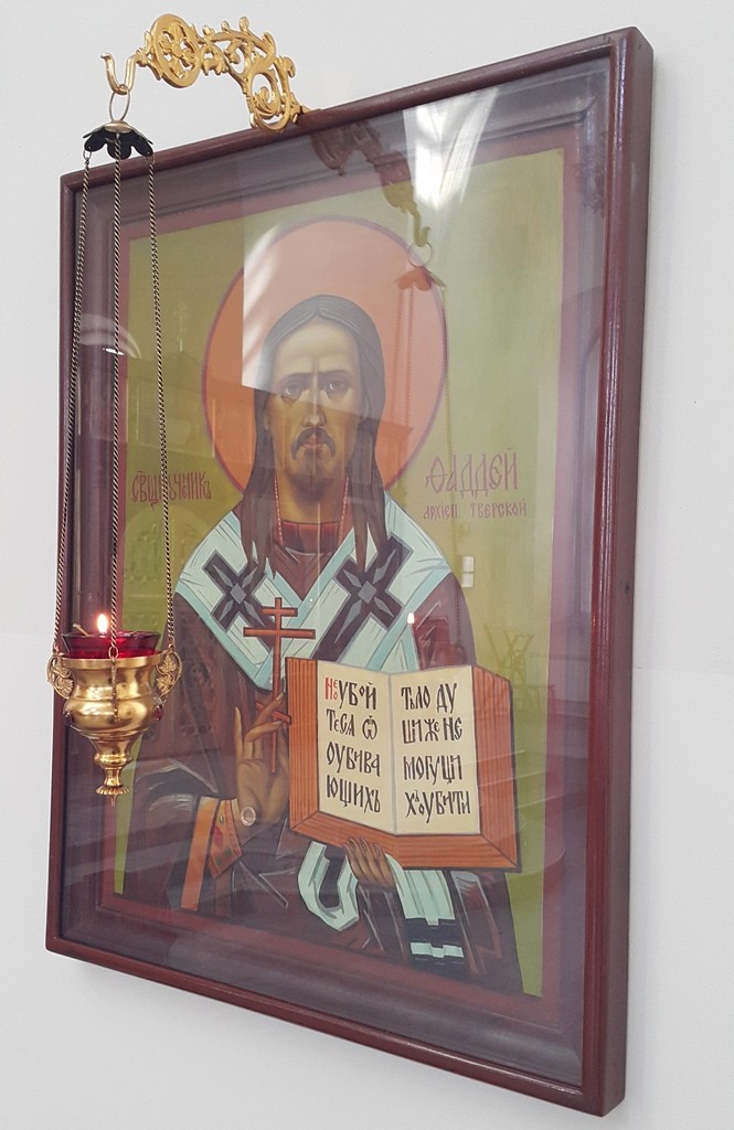 Священномученик Фаддей – святой 20 столетия. Был преподавателем, епископом, выдающимся деятелем своего времени на поприще церковного образования. Арестован и казнён коммунистическими властями СССР в 1937 году. Икона представляет собой поясное изображение святого.