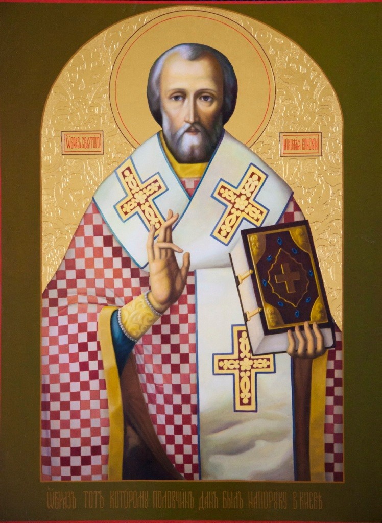 «В половине XI века (1055 г.) на границах Руси появилось дикое племя Половцев; поселившись на реке Дону близ притока его в Азовское море, они делали частые набеги на Русь, во время которых жгли города и села, грабили имущества, а жителей уводили в плен. В 1103 г. Половцы, благодаря Мономаху, были разбиты на голову, и многие из них взяты в плен и один из них достался благочестивому киевлянину Иоанну, особенно чтившему Святителя Николая; целый год Половчанин находился у него в плену, исполняя работы «железы окован»». Однажды Иван предложил ему отпустить его на свободу, если он даст за себя выкуп. Обрадовался Половчанин и обещал выкуп… поклялся перед иконою… Прибывши на родину, Половчанин не думал о выкупе. Но прошло несколько дней, к нему явился Святитель Николай в том виде, как был изображен на иконе… напомнил ему о выкупе… Подивился этому явлению Половчанин, подумал, что это не больше чем греза сна. Однако вскоре Святитель вторично явился ему, когда он ехал верхом в поле, с грозным напоминанием сбросил его с коня и стал трясти его с силою… В разгульной жизни /половчанин/забыл о своем намерении. Последовало третье явление Святителя. Половчанин, собравшись с силами, приказал слугам своим отделить два стада коней: одно для выкупа, другое в дар поручителю Святителю Николаю… Прибывши в Киев, он пригнал коней к церкви… пал перед иконою. Удивленный киевлянин поспешил в церковь Святителя Николая возблагодарил его и устроил пир для священников, монахов, родных и нищих» (Геронтий).
