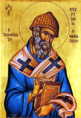 Святитель Спиридон Тримифунтский родился в конце III века на острове Кипр. О его жизни сведений сохранилось мало. Известно, что он был пастухом, имел жену и детей. Все свои средства он отдавал на нужды ближних и странников, за это Господь вознаградил его даром чудотворения: он исцелял неизлечимо больных и изгонял бесов. После смерти жены, в царствование императора Константина Великого (306—337), он был избран епископом города Тримифунта. В сане епископа святитель не изменил своего образа жизни, соединив пастырское служение с делами милосердия. По свидетельству церковных историков, святитель Спиридон в 325 году принимал участие в деяниях I Вселенского Собора. На Соборе святитель вступил в состязание с греческим философом, защищавшим ариеву ересь. Простая речь святителя Спиридона показала всем немощь. человеческой мудрости перед Премудростью Божией: «Слушай, философ, что я буду говорить тебе: мы веруем, что Всемогущий Бог из ничего создал Своим Словом и Духом небо, землю, человека и весь видимый и невидимый мир. Слово это есть Сын Божий, Который сошел ради наших грехов на землю, родился от Девы, жил с людьми, пострадал, умер для нашего спасения и затем воскрес, искупив Своими страданиями первородный грех, и совоскресил с Собою человеческий род. Мы веруем, что Он Единосущен и Равночестен со Отцем, и веруем этому без всяких лукавых измышлений, ибо тайну эту постигнуть человеческим разумом невозможно».