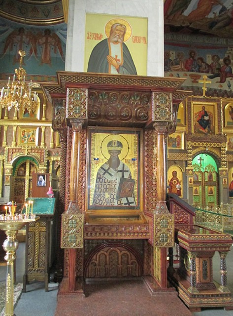 Икона святителя Тихона с частицей его мощей находится в центральной части храма на левой колонне. Частица