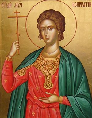 К сословию послан мучеников,/ мученик был еси истинен,/ пострадав за Христа крепчайше, всехвальне,/ мощми же возвратился еси верою пославшей тя, Вонифатие блаженне,/ моли Христа Бога// прияти нам грехов прощение.
