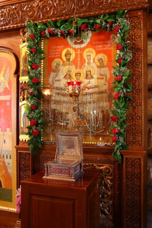 Днесь, благовернии людие, светло почтим/ седмерицу честную царственных страстотерпец,/ Христову едину домашнюю Церковь:/ Николая и Александру,/ Алексия, Ольгу, Татиану, Марию и Анастасию./ Тии бо, уз и страданий многоразличных не убоявшеся,/ от богоборных смерть и поругание телес прияша/ и дерзновение ко Господу в молитве улучиша./ Сего ради к ним с любовию возопиим:/ о святии страстотерпцы,/ гласу покаяния и стенанию народа нашего вонмите,/ землю Российскую в любви к Православию утвердите,/ от междоусобныя брани сохраните,/ мир мирови у Бога испросите// и душам нашим велию милость.