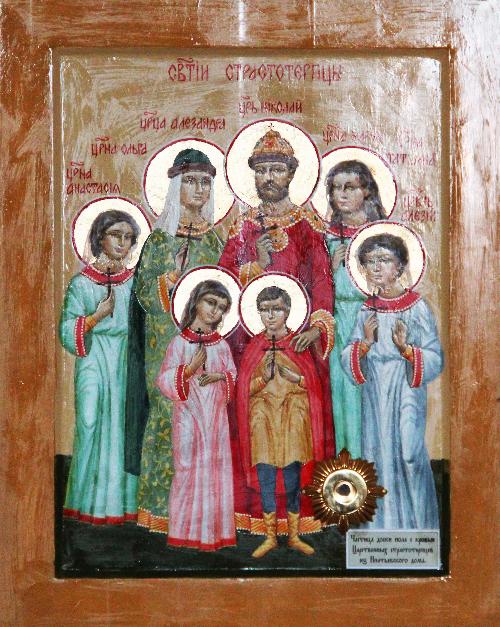 Икона Царственных страстотерпцев с частицей доски пола с кровью из Ипатьевского дома.