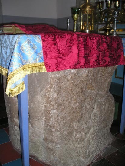 Дети не осмелились подойти к Ней, но поспешили сообщить о необыкновенном видении родителям. Когда жители села вместе со священником пришли на это место, то обрели на камне пропавшую икону, а сам камень запечатлел на себе след стопы Божией Матери.