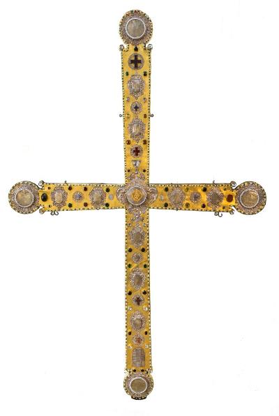Украшают святыню маленькие крестики из полудрагоценных камней: яшмы и лазурита, также лицевая сторона обнизана жемчугом. На поверхности ковчежцев искусно выгравированы лики святых и изображения праздников. Принесен в монастырь во второй половине 17 века старообрядцами.
