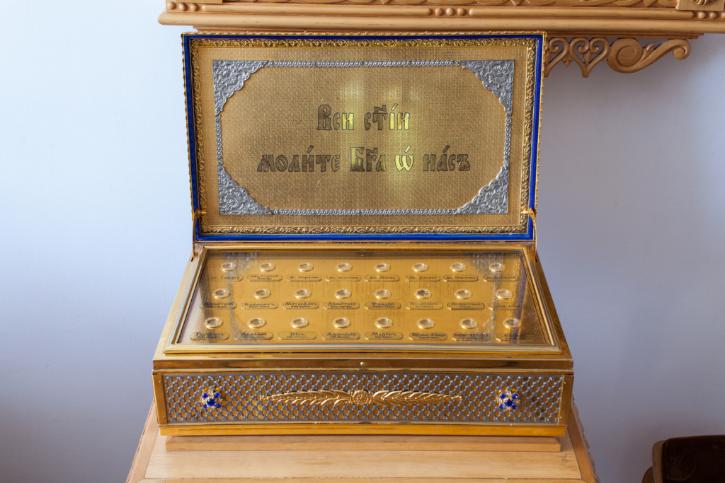 Ковчег-мощевик с частицами святых мощей: великомученика Димитрия Солунского, священномученика Климента, папы Римского, святителя Митрофана Воронежского, святителя Димитрия Ростовского, священномученика Фаддея Тверского, преподобных Герасима Болдинского, Авраамия Ростовского, Нила Столобенского, Афанасия Высоцкого, Максима Грека, мучеников Черниговских, благоверного князя Константина Ярославского, блаженного Василия Московского и Вифлеемского младенца.