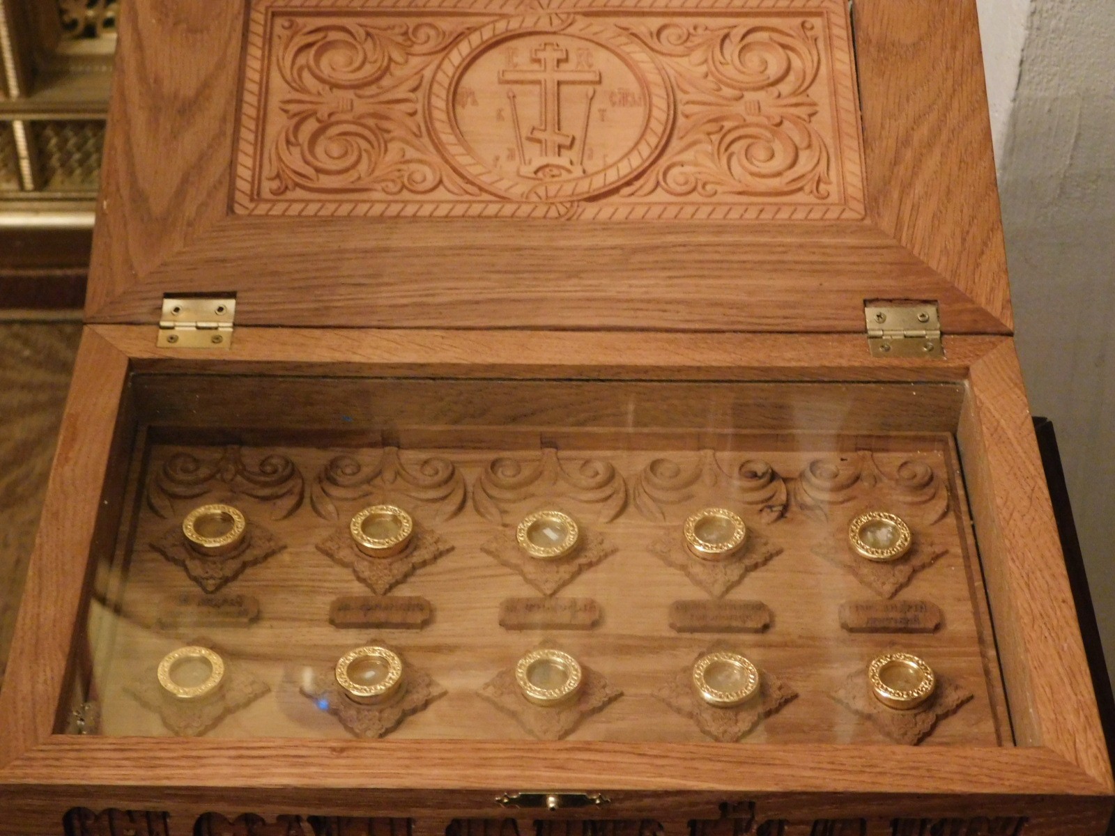 В двух мощевиках находятся частицы следующих мощей: ап. Андрей, ап. Филипп, ап.Павел, ап. Тимофей, свт. Спиридон Тримифунтский,первомч. архидиак. Стефан, вмч. и Поб. Георгий, прпмч. Андрей Критский, сщмч. Игнатий Богоносец,вмц. Варвара, мч. Вонифатий, мц. Ирина, мц. Наталия, мц. Иустина, свт. Василий Великий, свт. Нектарий Эгинский , прав. Олимпиада диаконисса, прав. Анна, прп. Иоанн Лествичник,