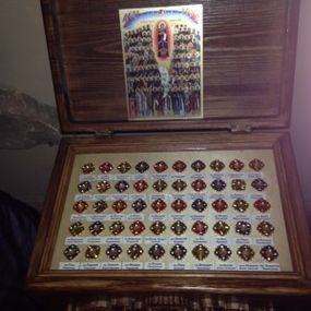 В большом ковчеге — частицы мощей великих отцев-наставников монахов всех времен и тех подвижников, чей подвиг был не так заметен, но все они стяжали в своем житии Святого Духа, и ныне подают исцеления и укрепляют верующих, припадающих к ним и взывающих о заступлении. Своими святыми мощами здесь покоятся отцы древности: прпп. Антоний Великий, Макарий Великий, Феодосий Великий, Онуфрий Великий, Савва Освященный. Знаменитый церковный гимнотворец смиренный Иоанн Дамаскин и презревший земную славу преподобный Авксентий Вифинский, верный сын Православной Церкви преподобный исповедник Михаил Синадский, бесстрашный Харитон Исповедник, отринувший все пристрастия мира Серапион Синдонит. Рядом — преподобный Авраамий затворник, спасший свою племянницу преподобную Марию и преподобный Зосима Палестинский, сподобившийся причастить великую Марию Египетскую,