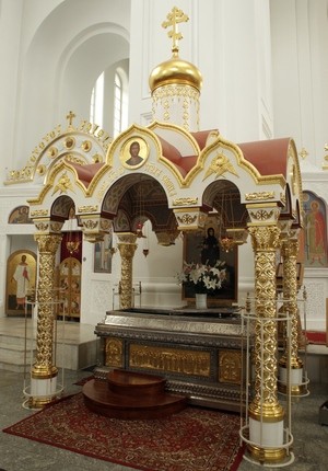 В июне 1960 года Полоцкий городской совет депутатов трудящихся обращался с ходатайством в вышестоящие органы об изъятии из Спасо-Евфросиниевской обители мощей преподобной Евфросинии и перенесении их в Полоцкий историко-краеведческий музей. Вместе с тем, Полоцкий горсовет постановил «просить исполком Витебского областного совета депутатов трудящихся войти в ходатайство перед Советом Министров БССР по делам Русской Православной Церкви… о закрытии Полоцкого Спасо-Евфросиниевского монастыря»[22]. В скором времени власти распорядились о закрытии Полоцкой обители[23], однако святотатственному намерению перенести святые мощи в музей Господь не допустил осуществиться. Мощи преподобной Евфросинии и после того, как Спасская обитель официально перестала существовать, оставались в древней монастырской церкви Спаса, переданной на попечение приходской общины и долгие годы являвшейся единственной действующей в Полоцке и его окрестностях. Все это время святые мощи почивали близ алтаря, в деревянной гробнице. И лишь один раз в году, в день памяти преподобной Евфросинии, по окончании богослужения, при закрытых дверях, гробницу открывали и верующие могли приложиться к святыне. В конце 80-х годов для мощей преподобной была изготовлена новая резная дубовая рака с сенью[24].