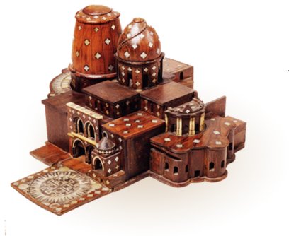 Иерусалим, 1-я четверть 17 века. Кипарис, слоновая кость, перламутр, резьба, токарная работа. Привезена в Москву в 1649 году Иерусалимским патриархом Паисием. Эта модель использовалась Патриархом Никоном при строительстве Воскресенского собора Нового Иерусалима – копии Иерусалимского Храма Гроба Господня.
