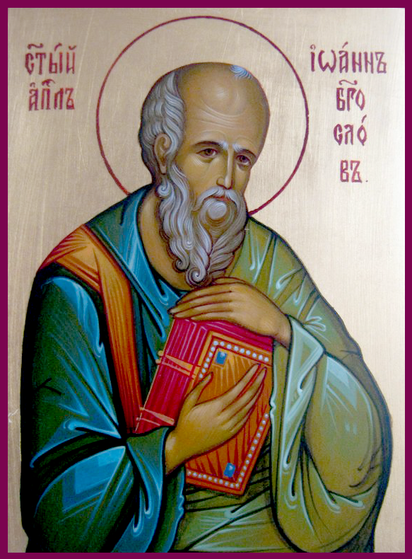 Разумом истиннаго богопознания озаряя твою душу, шествовал еси по благом Учителе твоем, учася из уст Его исходящей премудрости, и ради совершеннаго твоего незлобия, и девственнаго целомудрия, был еси возлюблен Христом Господем твоим. Услыши убо нас, воспевающих ти сице: Радуйся, вместилище благодатныя силы Божия. Радуйся, премудрости Божия проповедниче. Радуйся, ум божественный стяжавый. Радуйся, Христово Евангелие нам оставивый. Радуйся, тобою бо Дух Святый дарова словеса спасения. Радуйся, яко писании твоими тайны веры нам открываеши. Радуйся, свет божественнаго учения в сердце своем носивый. Радуйся, яко и нас тем же светом озаряеши. Радуйся, семя слова Божия в сердца многих людей всеявый. Радуйся, к познанию истинныя веры тех наставивый. Радуйся, всю вселенную богословием твоим просветивый. Радуйся, яко Церковь Христова Богослова тя нарече. Радуйся, Иоанне Апостоле, наперсниче Христов и Богослове.
