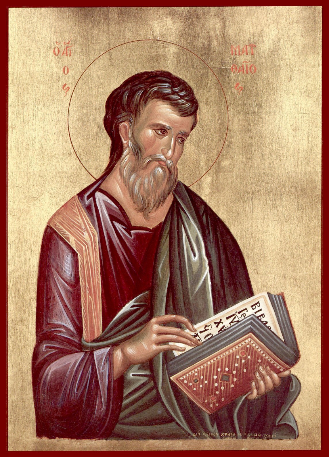 Был апостолом из двенадцати. До обращения ко Христу Матфей служил мытарем, сборщиком податей для Рима. Услышав глас Иисуса Христа: «Иди за Мной» (Мф.9.9), он оставил свою должность и пошел за Спасителем. Восприняв благодатные дары Духа Святого, апостол Матфей вначале проповедовал в Палестине. Перед уходом на проповедь в дальние страны по просьбе иудеев, остававшихся в Иерусалиме, апостол написал Евангелие. В ряду книг Нового Завета Евангелие от Матфея стоит первым. Написано на еврейском языке. Речи и деяния Спасителя Матфей излагает в соответствии трем сторонам служения Христа: как Пророка и Законодателя, Царя над миром невидимым и видимым и Первосвященника, Приносящего Жертву за грехи всех людей.
